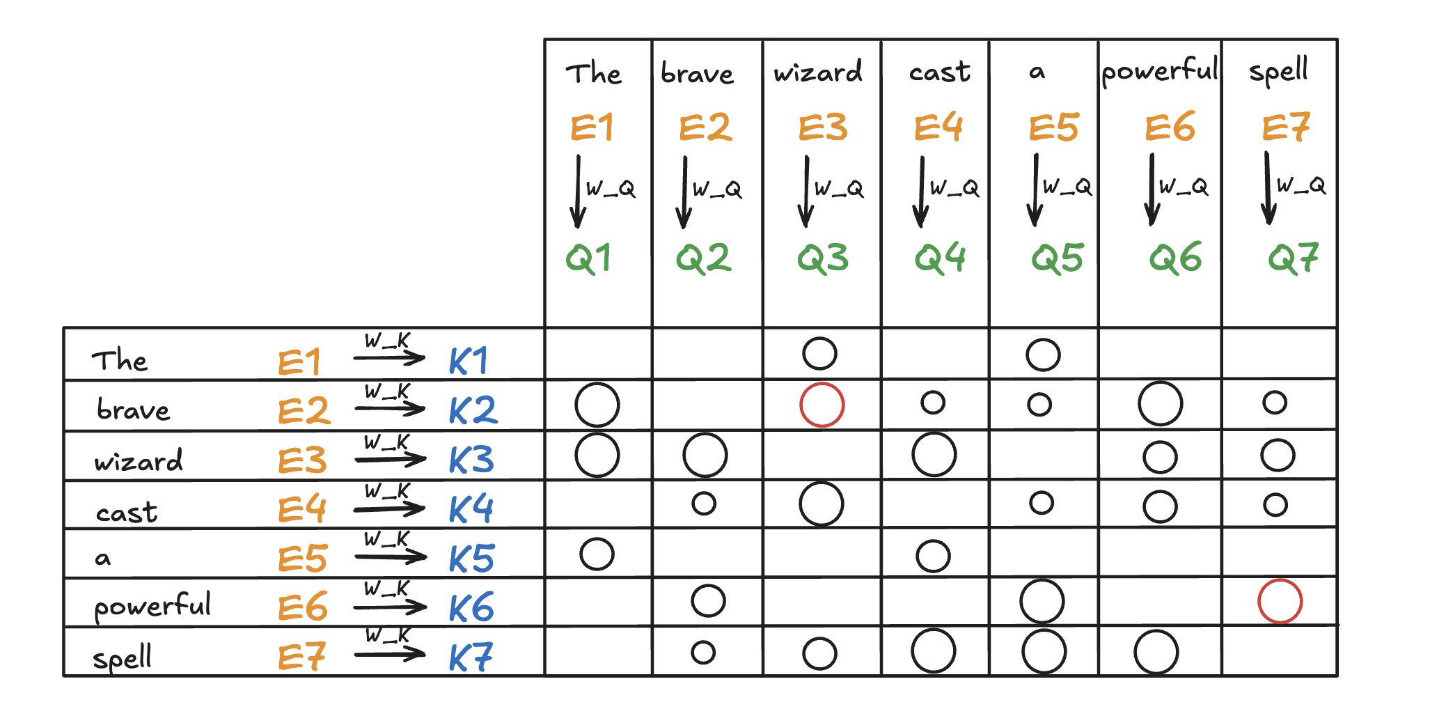 \[\begin{split}K &= W_E W_K \\ (N \times d) (d \times d_k) &\rightarrow (N \times d_k)\end{split}\]Conceptually, the keys are answering the queries by matching the queries whenever they closely align with each other. In our example of “The brave wizard cast a powerful spell”, the key metrix maps the word ‘brave’ to vectors that are closely aligned with the query produced by the word ‘wizard’.