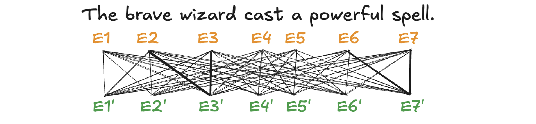 A self-attention is called single-head attention, which enables the model to effectively capture relationships and dependencies between different tokens within the same input sequence. Multi-headed attention has multiple self-attentions running in parallel. The goal of self-attention is to produce a refined embedding where each word has ingested contextual meanings from other words by a series of computations. For example, in the input of “The brave wizard cast a powerful spell”, the refined embedding E3’ of ‘wizard’ should contain the meaning of ‘brave’, and the refined embedding E7’ of ‘spell’ should contain the meaning of ‘powerful’.