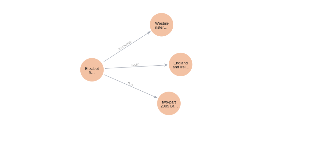 Elizabeth - RULED -> Russia Elizabeth - BORN_IN -> Greenwich Palace Elizabeth - BORN_IN -> Kolomenskoye Elizabeth - RULES -> England Elizabeth - IS_A -> 1998 British biographical historical drama film Elizabeth - WAS_MARRIED_TO -> William Carey in-waiting - IS_WAITING_FOR -> Elizabeth Elizabeth Stuart - BORN_IN -> Dunfermline Palace Elizabeth Stuart - TRAVELLED -> Scotland Elizabeth I - RULED -> England and Ireland Elizabeth I - CORONATED -> Westminster Abbey Elizabeth I - IS_A -> two-part 2005 British-American historical drama television serial Becoming Elizabeth - REPEATED -> 15 July 2023Isabella I - BORN_IN -> Madrigal de las Altas Torres Elizabeth I - RULED -> England and Ireland Elizabeth I - CORONATED -> Westminster Abbey Elizabeth I - IS_A -> two-part 2005 British-American historical drama television serial Rip Hunter ... Time Master - PUBLISHES -> Elizabeth I of England James VI and I - RULES -> Scotland