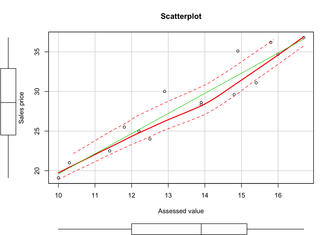 scatterplot(y1,y2, main="Scatterplot", xlab = "Assessed value", ylab = "Sales price")