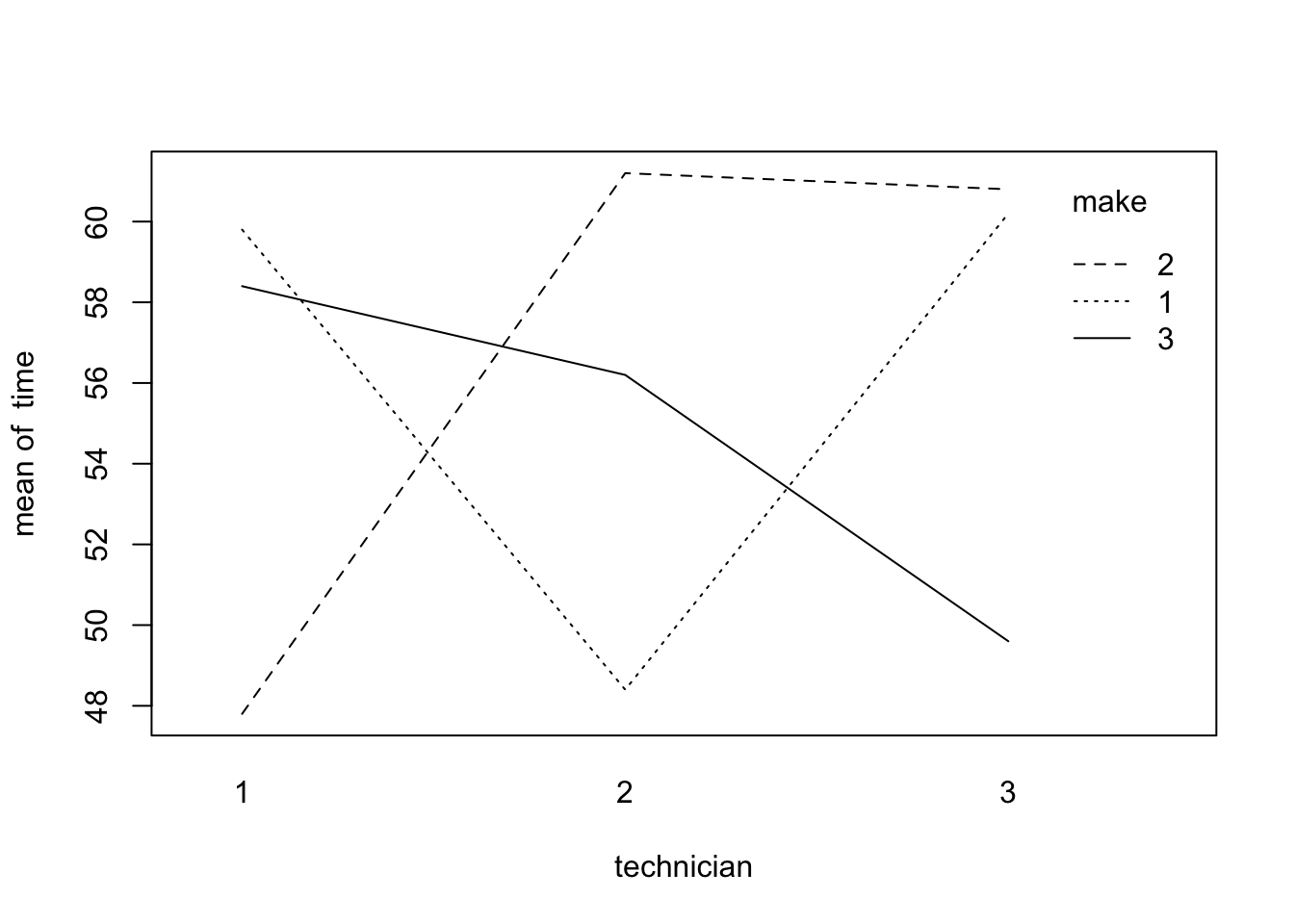 anova2way = aov(time~technician+make+technician:make, data=dt)
